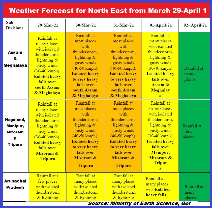 New Delhi, March 29 (PTI): The Indian Meteorological Department (IMD) has issued an orange colour alert for Assam, Meghalaya, Nagaland, Manipur, Mizoram and Tripura for March 30-31 with a forecast of rains and thunderstorm over these northeastern states.