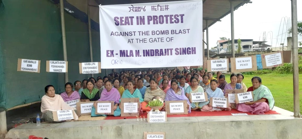Women protesting after a bomb exploded outside a former MLAs home in Imphal.