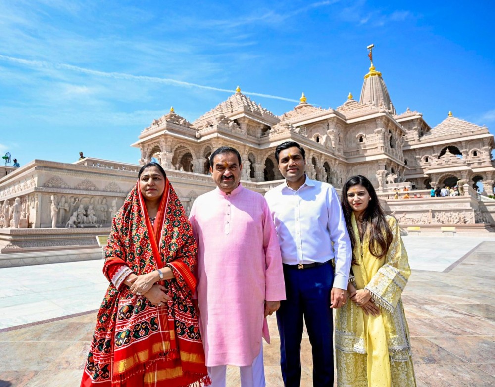 Ayodhya: Adani Group Chairman Gautam Adani with his wife Priti Adani, their son Karan Adani and daughter-in-law Paridhi Adani pose for a photograph during their visit to the Shri Ram Janmabhoomi Temple in Ayodhya, Uttar Pradesh, on Thursday, April 2, 2026. (Photo: IANS)