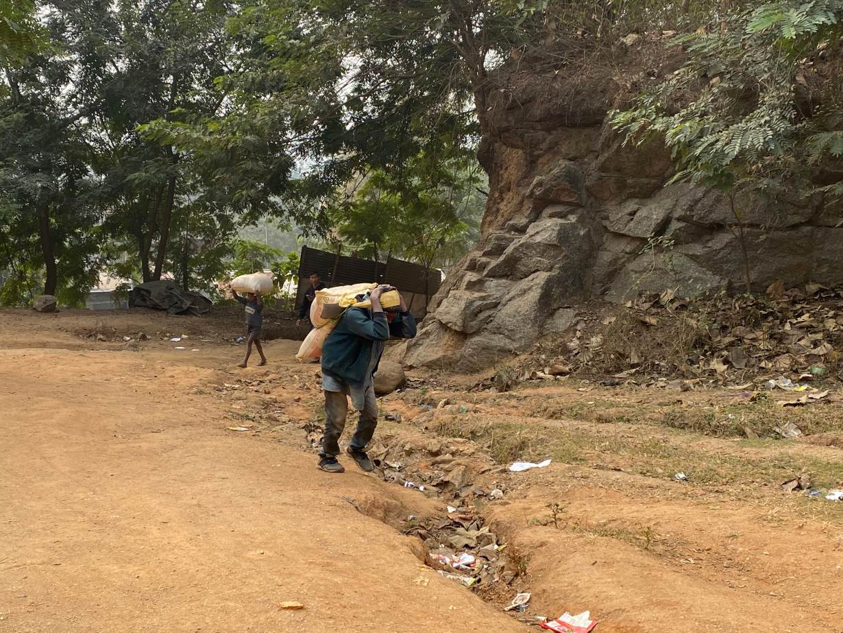 A man carrying supplies makes his way up the path of an informal hill settlement in Guwahati, Assam in India. January 28, 2020. Thomson Reuters Foundation/Rina Chandran