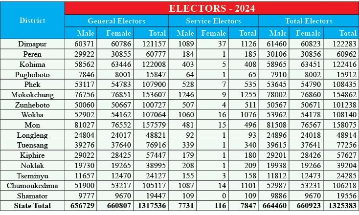 DIMAPUR, APRIL 6 (MExN): A total of 1325383 electors, which includes 656729 males and 660807 females, is expected to exercise their franchise at the upcoming general election to the Lok Sabha from 1-Nagaland Parliamentary Constituency, 2024 come April 19.