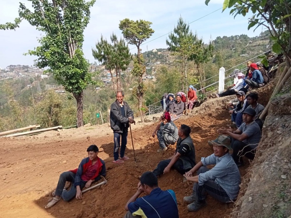 The chief of Natha New Village, Zunheboto who is also the ‘oldest grandfather’ narrates his life stories and Sumi history to the younger generation during the village mass social work. (Morung Photo)