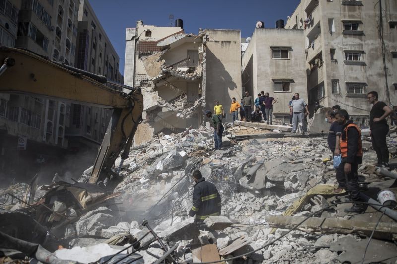 Palestinian rescuers search for survivors under the rubble of destroyed residential buildings following deadly Israeli airstrikes in Gaza City on May 16, 2021. The Israeli airstrikes flattened three buildings and killed at least 26 people Sunday, medics said, making it the deadliest single attack since heavy fighting broke out between Israel and the territory's militant Hamas rulers nearly a week ago. (AP/PTI Photo)