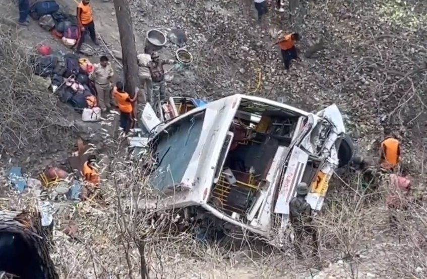 A bus carrying pilgrims from Hathras (UP) went out of the driver’s control and skilled off the road before it dropped into a 150 ft deep gorge in the Chungi Morh area of Akhnoor on the Jammu-Poonch highway.