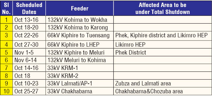Kohima, October 13 (MExN): The scheduled jungle clearance and maintenance programme of 132kV, 66kV & 33kV lines will result in intermittent disruption of power supply in several locations under the feeders till November 14.