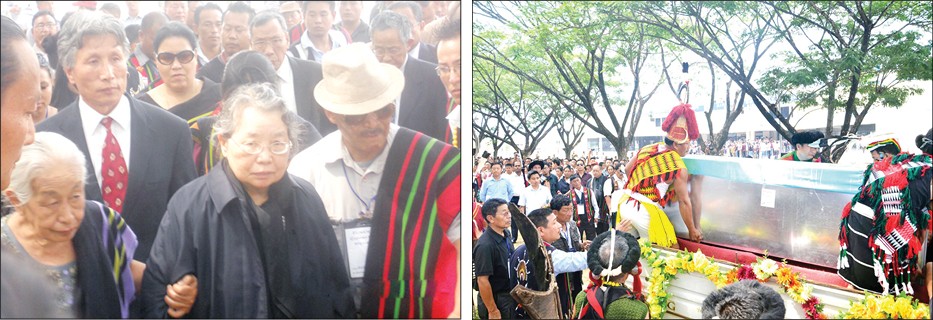 (Left) President of the Naga National Council, Adinno Phizo, seen here coming out of the Dimapur Airport. She arrived in Nagaland today from London to lay to rest her younger brother Kevilevor Phizo’s body. (Newmai News Network Photo) (Right) Naga men accompany the body of Kevilevor Phizo, the eldest son of Naga leader AZ Phizo, after a public reception held at Dimapur Airport on Saturday, April 27, 2013. (Photo by Caisii Mao)