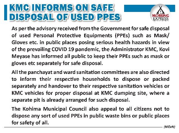 Kohima, June 20 (MExN): As per the advisory received from the Government for safe disposal of used Personal Protective Equipments (PPEs) such as Mask/Gloves etc. in public places posing serious health hazards in view of the prevailing COVID 19 pandemic, the Administrator KMC, Kovi Meyase has informed all public to keep their PPEs such as mask or gloves etc separately for safe disposal. All the panchayat and ward sanitation committees are also directed to inform their respective households to dispose or packed separately and handover to their respective sanitation vehicles or KMC vehicles for proper disposal at KMC dumping site, where a separate pit is already arranged for such disposal. The Kohima Municipal Council also appeal to all citizens not to dispose any sort of used PPEs in public waste bins or public places for safety of all.