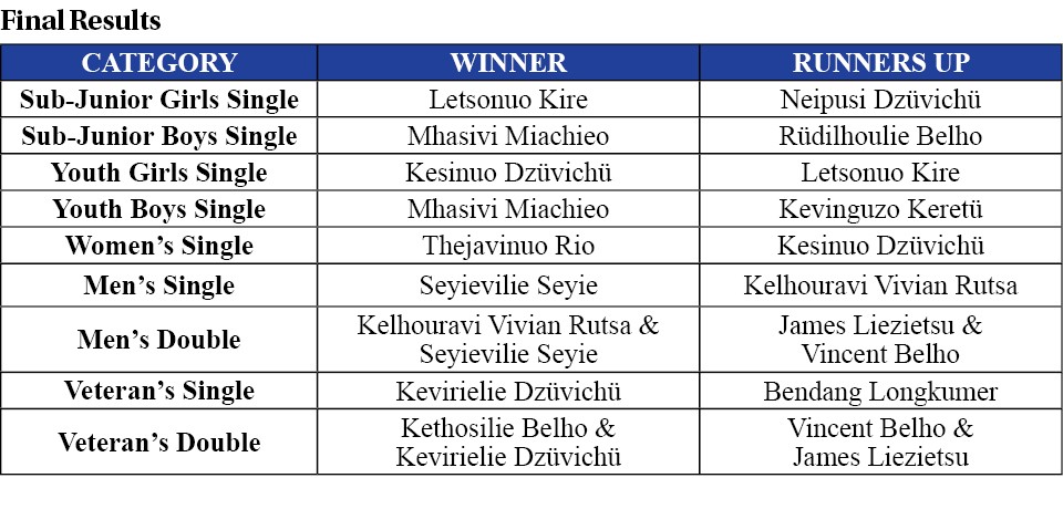 KOHIMA, July 30 (MExN): The three-day 12th Kohima District Table Tennis Championship concluded on July 29 at the Kohima Indoor Table Tennis Stadium. The table tennis fraternity observed a minute silence in respect and memory of late Kevilevor Metha, former Nagaland State player before the commencement of the prize distribution.
