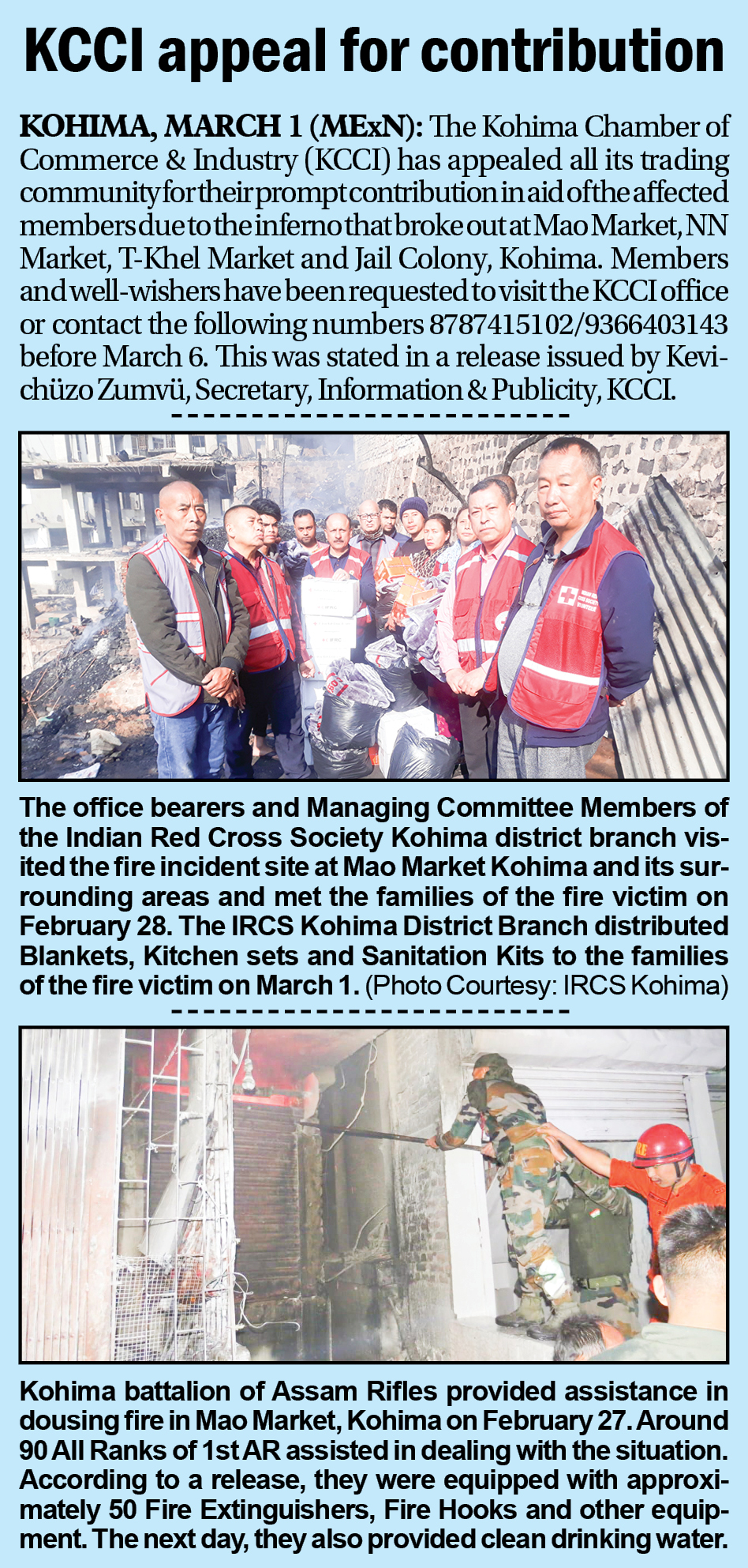 Kohima, March 1 (MExN): A relief fund was distributed to the fire victims and vendors of Mao Market and NN Market which were completely razed down on February 27. As an immediate relief fund, a sum of Rs 20 lakh was given by the Chief Minister of Nagaland, Neiphiu Rio and Rs 30 lakh by the Nagaland State Disaster Management Authority (NSDMA), stated an update received here.