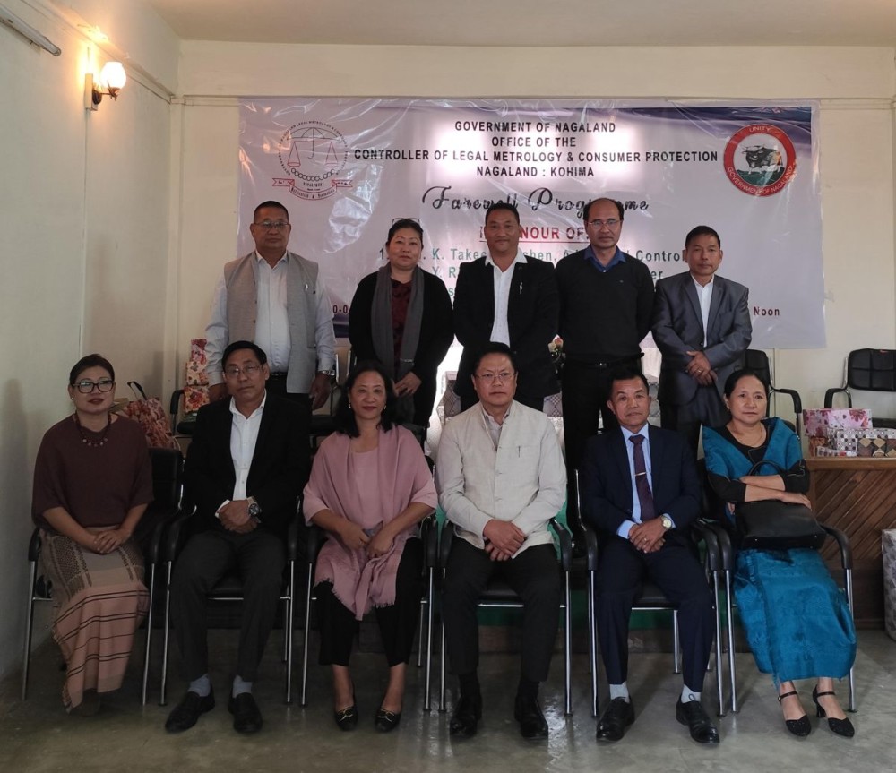 Kohima, May 1 (MExN): The Department of Legal Metrology & Consumer Protection, Government of Nagaland, held a farewell programme at the Directorate conference hall in honour of K Takeeth Imchen (Additional Controller), Y Rilise Sangtam (Joint Controller), and Nukshimenla (Steno Grade II).