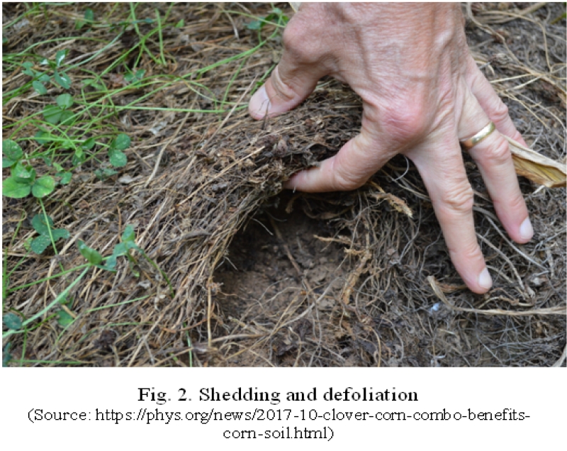 2) Increase soil organic matter content: Living mulches build the year round organic matter through incorporation of its residues through shedding and defoliation in the soil (Fig. 2). It becomes concentrated at the soil surface, which greatly improves the soil tilth maintains soil permeability and aeration, overall maintaining the soil health and productivity.