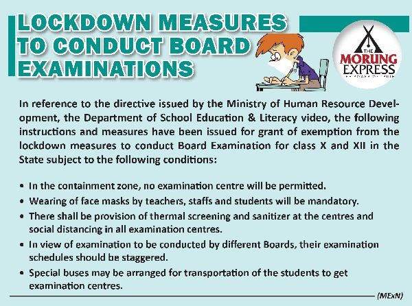 Kohima, June 19 (MExN): In reference to the directive issued by the Ministry of Human Resource Development, the Department of School Education & Literacy video, the following instructions and measures have been issued for grant of exemption from the lockdown measures to conduct Board Examination for class X and XII in the State subject to the following conditions: