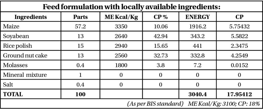 A good quality layer mash with BIS specifications should be provided to the laying birds. The feed maybe given in linear feed troughs or in hanging feeders. Provide 5 hanging feeders, each 50 cm in diameter with 20-25kg capacity for 100 layers. Place the feeders within 3 meters of waterer. Stir the feed few times a day to promote eating. Water space of 2.5 linear cm per bird should be provided. Increasing watering space 25% when temperature goes above 27°C. The feeders in the laying pen must be positioned in such a way that the upper edge is slightly higher than back of the birds. The feeder should not be filled more than 1/3 full.