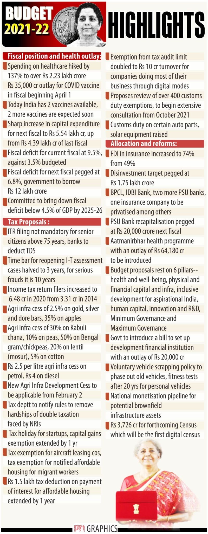In her third budget presentation in the Parliament on Monday, Finance Minister Nirmala Sitharaman proposed to unleash massive fiscal expansion in 2021-22 on the back of high borrowings, fire sales and an agricultural cess.