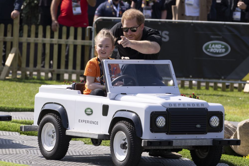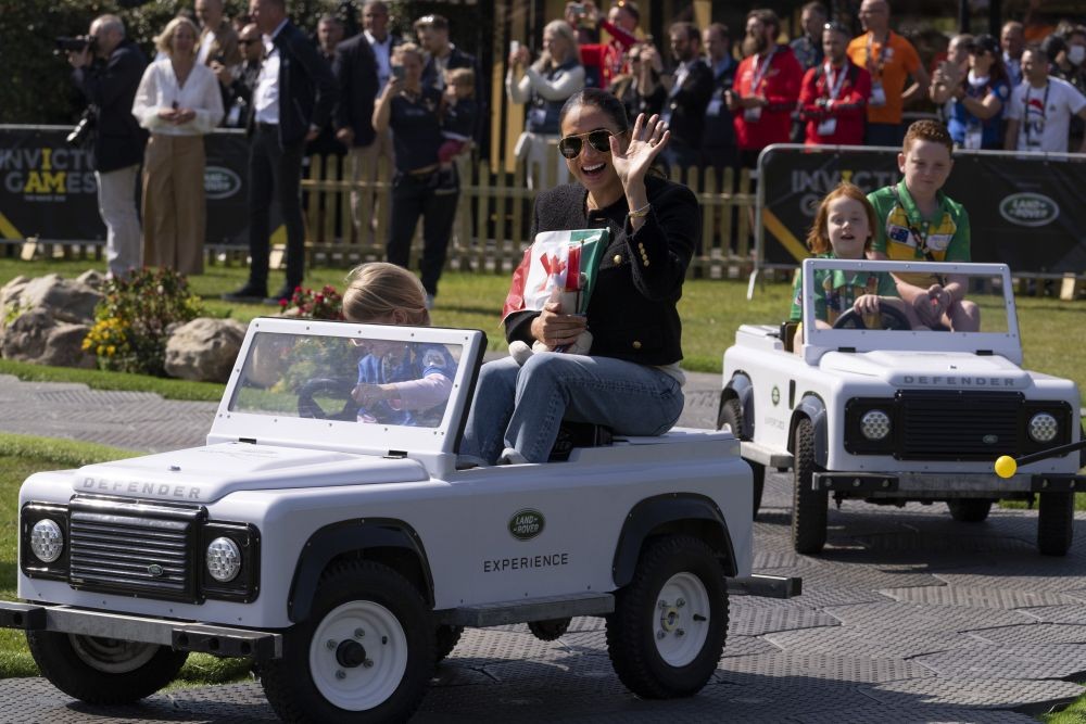 The Hague : Meghan Markle, Duchess of Sussex, waves from a mini Land Rover driven by a child when attending the Land Rover Driving Challenge at the Invictus Games venue in The Hague, Netherlands, Saturday, April 16, 2022. The week-long games for active servicemen and veterans who are ill, injured or wounded opens Saturday in this Dutch city that calls itself the global center of peace and justice. AP/PTI