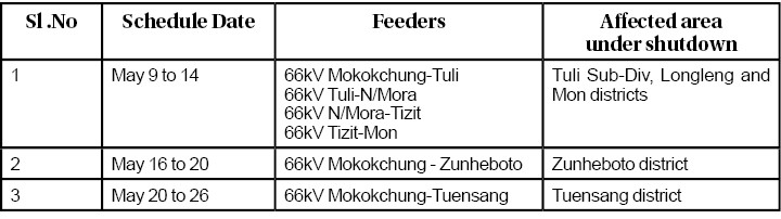 Mokokchung, May 6 (MExN): The Department of Power, Executive Engineer, Transmission Division, Mokokchung has informed that vegetation clearance for 66kV Transmission Lines under Transmission Division Mokokchung are scheduled from May 9 to 26.