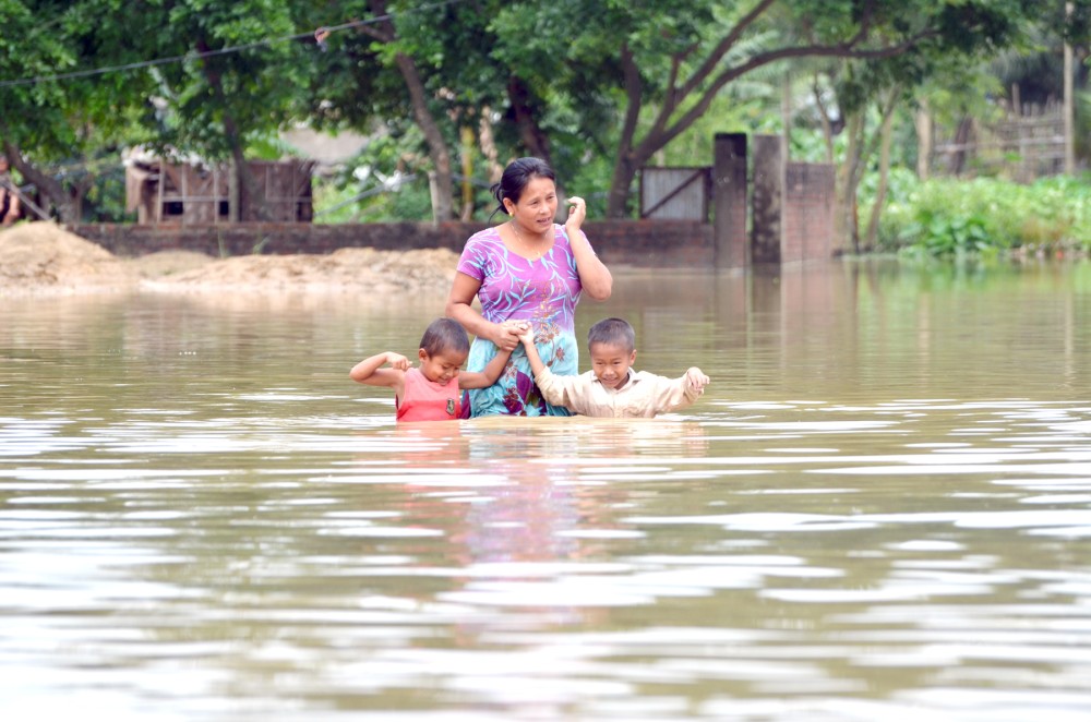 A woman anxiously holds on to two children as they wade through a water-logged low-lying area towards higher ground after heavy pre-monsoon rain flooded surrounding areas at Ragailong colony in Dimapur, Nagaland on Thursday. Photo by Caisii Mao
