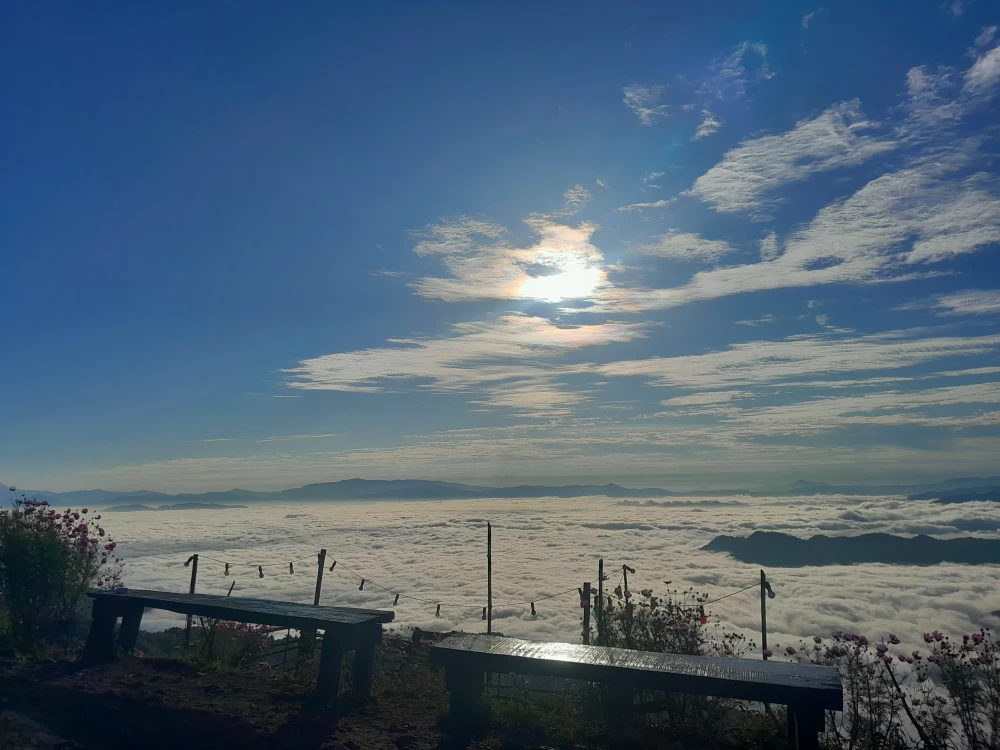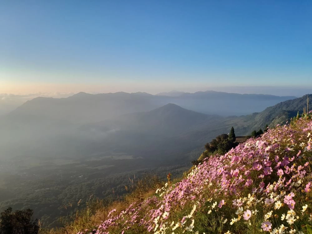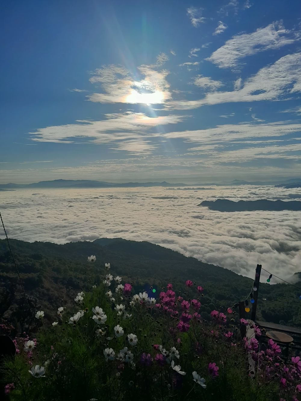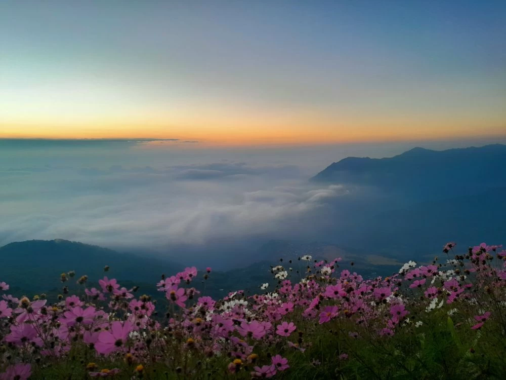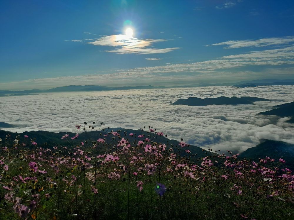 Nature’s breathtaking beauty unfolds as sea of clouds embraces the mountains, while vibrant cosmos flowers in full bloom create a stunning foreground on top of Mt Kapamodzü in Phek district in an early morning serene spectacle. (Photo Credit: Rose Rekha Dukru)