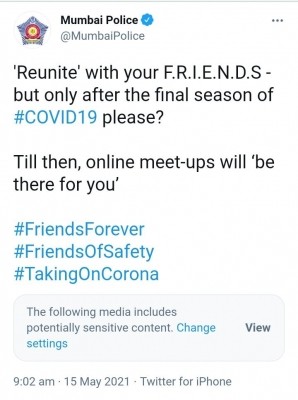 Mumbai, May 15 (IANS): Mumbai Police have given a witty, quirky twist to the much-hyped and upcoming "Friends" reunion special, in a bid to create Covid-19 awareness.