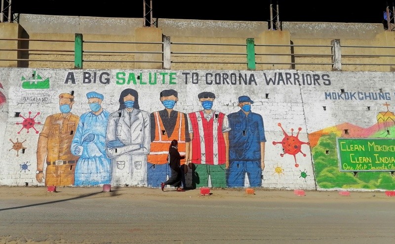 A woman walks past a freshly painted mural in Mokokchung town. A whole stretch of wall below the Imkongmeren Sports complex was painted with murals by the District Administration in collaboration with DLCW, BBBP Mokokchung, District Election Office, Sakhi One Stop Centre and Mokokchung Municipal Council. (Morung Photo)