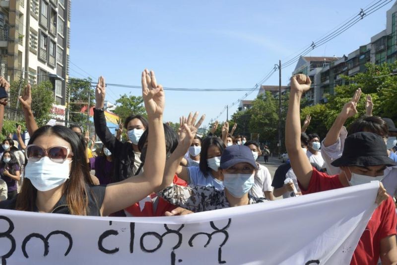 Anti-coup protesters flash the three-finger salute during a demonstration in Yangon, Myanmar on May 14, 2021. (AP Photo)