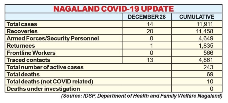 DIMAPUR, DECEMBER 28 (MExN): 14 new cases of COVID-19 were detected in Nagaland on December 28 taking the State’s tally to 11,911. This was out of 145 samples tested.