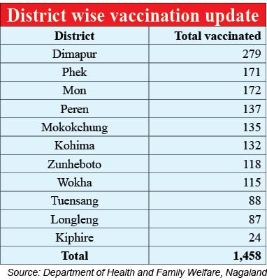 DIMAPUR, JANUARY 18 (MExN): 1,458 healthcare workers have been vaccinated in the State as of January 18. 897 healthcare workers including doctors, nurses and supporting staff were vaccinated with the Covishield vaccine in Nagaland on Monday.