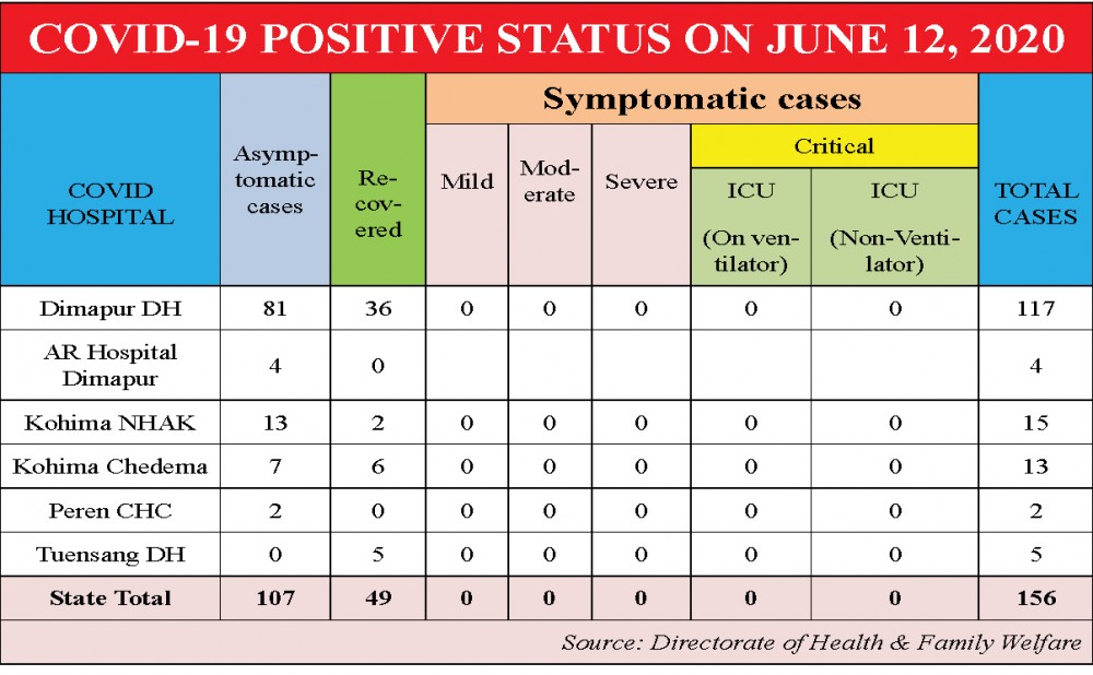 As per the Directorate of Health & Family Welfare, out of the recovered cases, 6 are in Chedema, 5 in Tuensang DH, 2 in NHAK and 36 from Dimapur DH.