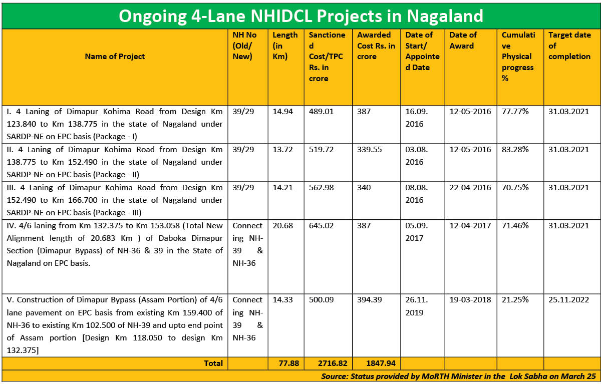 The extended deadline for the project within Nagaland was March 31, 2021, as cited by the Minister of Road Transport and Highways (MoRTH) Nitin Gadkari in reply to a question in Lok Sabha seeking the details of four and six-laning projects approved for North Eastern States during the last three years and their status on March 25.