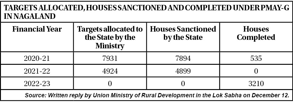 The MoS reply further suggested that while Nagaland marginally missed the target in Financial Years 2020-21, 2021-22, the State completed 3210 houses without being assigned any targets or sanctions in Financial Years 2022-23 (see table).