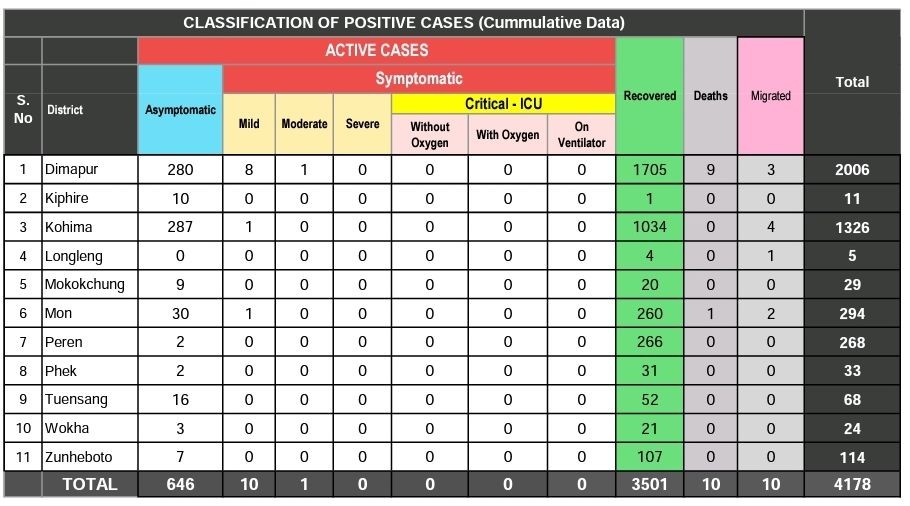 The total recovery of the state was 3510 as on September 6 as per the Nagaland COVID-19 bulletin issued by the State Health and Welfare Department. Meanwhile, Dimapur once again accounted for majority of the new COVID-19 cases in the daily update with 42 out of 50 cases being from the district. 7 were from Kohima and 1 in Mon.
