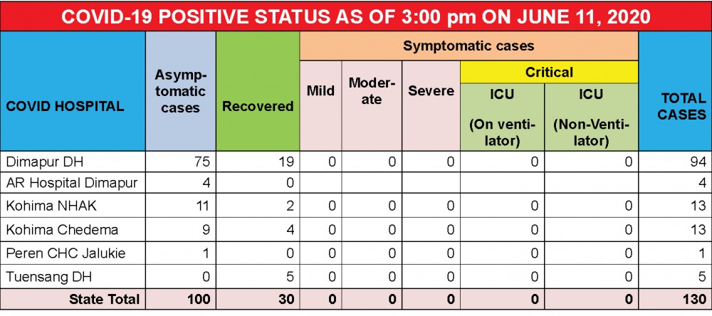 Meanwhile late in the evening on June 11, Tuensang also reported one more negative test result from the COVID-19 positive patients admitted at the district COVID Hospital, taking the daily tally of recovered cases in the state to 8 for the day.