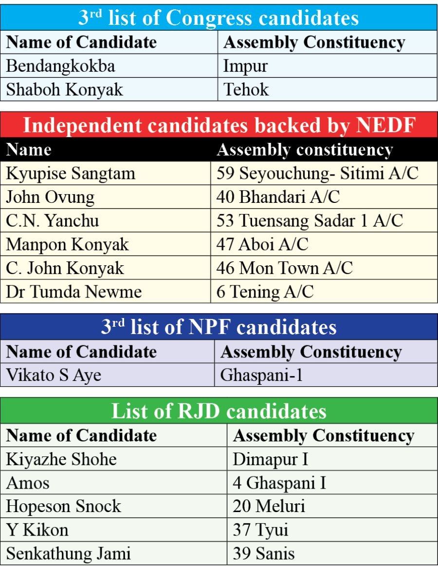 DIMAPUR, FEBRUARY 6 (MExN): The Rashtriya Janata Dal, the Nagaland Pradesh Congress Committee, the newly formed North East Democratic Front, and the Naga People’s Front today announced more candidates for the ensuing Nagaland Assembly Elections scheduled for February 27.