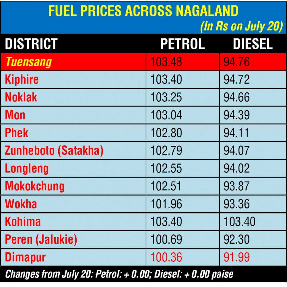 Fuels prices across Nagaland remained unchanged for fourth consecutive day on July 21 with the Oil marketing companies (OMCs) pausing the revision for longest period in weeks.