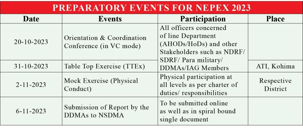 A report from the DIPR informed that NEPEx 2023 will simulate earthquake and extreme weather condition. An orientation and coordination conference will be held on October 20 by the NDMA in collaboration with NSDMA in a virtual mode. The AHoD/HoDs concerned to attend the VC along with officers of their Departments/Directorates, and the DDMAs have been requested to attend the VC along with the DDMA members.