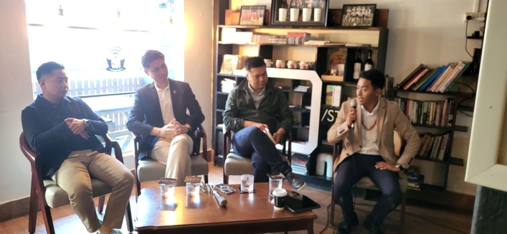 Speakers (from left) Theja Tsukru, Boka K Rochill and Kevisato Sanyu along with Moderator Akho Phira during the Dialogue Series organized by Global Shapers Community, Kohima at D'Cafe, Kohima or May 9. (Morung Photo)