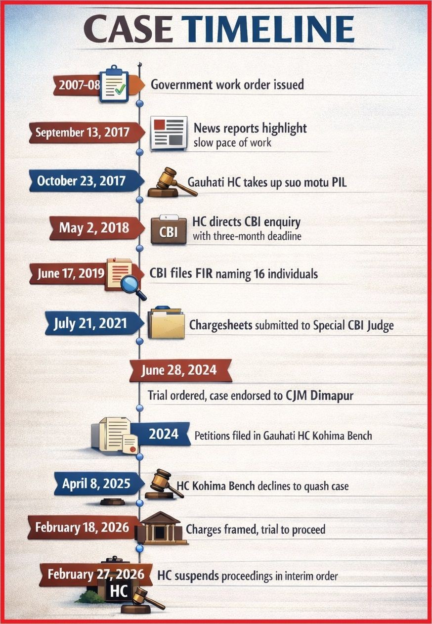 February 27, 2026: HC Kohima Bench, in an interim order, suspends further proceedings of the case pending before the CJM, Dimapur till the next returnable date in four weeks. Render as an infographic timeline