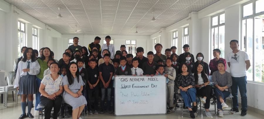GHS Nerhema Model: Government High School Nerhema Model, Kohima observed WED under the theme ‘Beat Plastic Pollution/Solution to Plastic Pollution.’ Thejakhrielie Solo spoke on the theme and the significance of the day while Thejazelie Tase, Headmaster incharge administered the pledge to the gathering. The students participate in paper bag making followed by planting plants in the school surrounding.