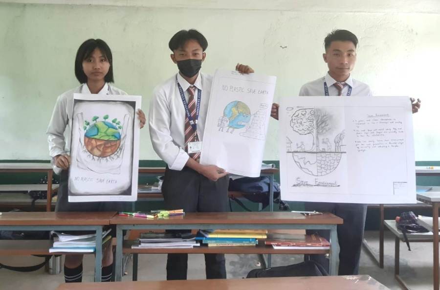Modern HSSS: Modern Higher Secondary School, Kohima observed WED under the theme ‘Solution to Plastic Pollution.’ The students and teachers participated in cleaning the nearby campus locality covering Mohonkhola, Dzüvürü area. A short programme was conducted at the school campus by Class 12 science students. Experiments were demonstrated on the toxicity of burning plastic and its hazardous effects on environment and health, followed by students and teachers undertaking the pledge.