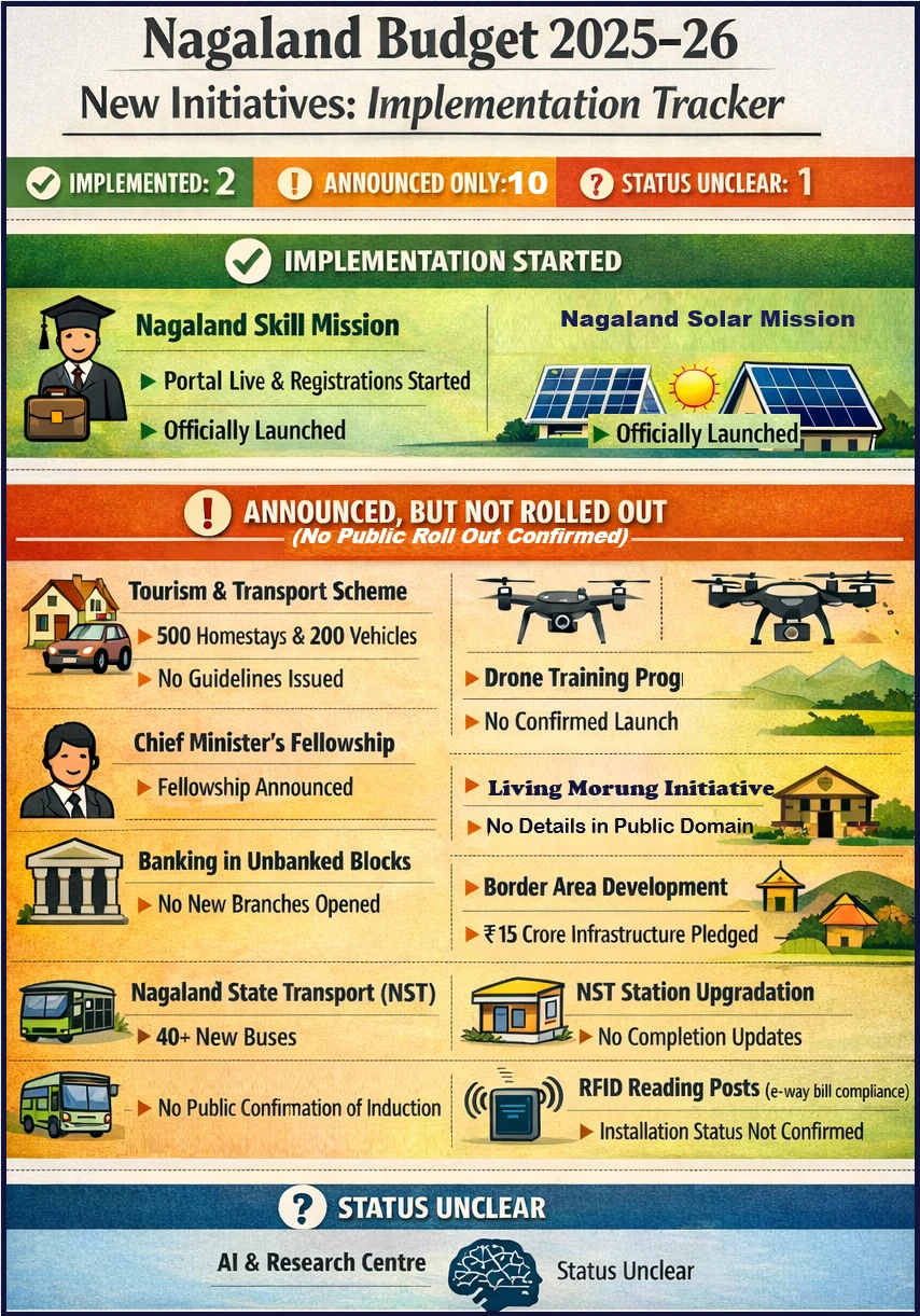With just one quarter left in the financial cycle, a review of the Nagaland Budget 2025–26 showed that only a limited number of new initiatives announced in the budget had translated into visible implementation.