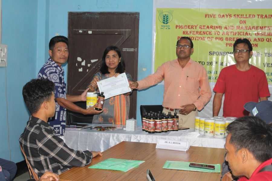 KVK Peren, ICAR-RC for NEH Region, Nagaland Centre, Jalukie organized skilled training on ‘Piggery Rearing and Management with Special Reference to Artificial Insemination for Promotion of Pig Breeding & Quality Piglet Production’ from May 22 to 26. The training programme was sponsored under TSP, stated a press release issued by KVK Peren. Certificates and veterinary medicines like mineral mixture, vitamin & Iron supplement, potash etc were also distributed to the participants.