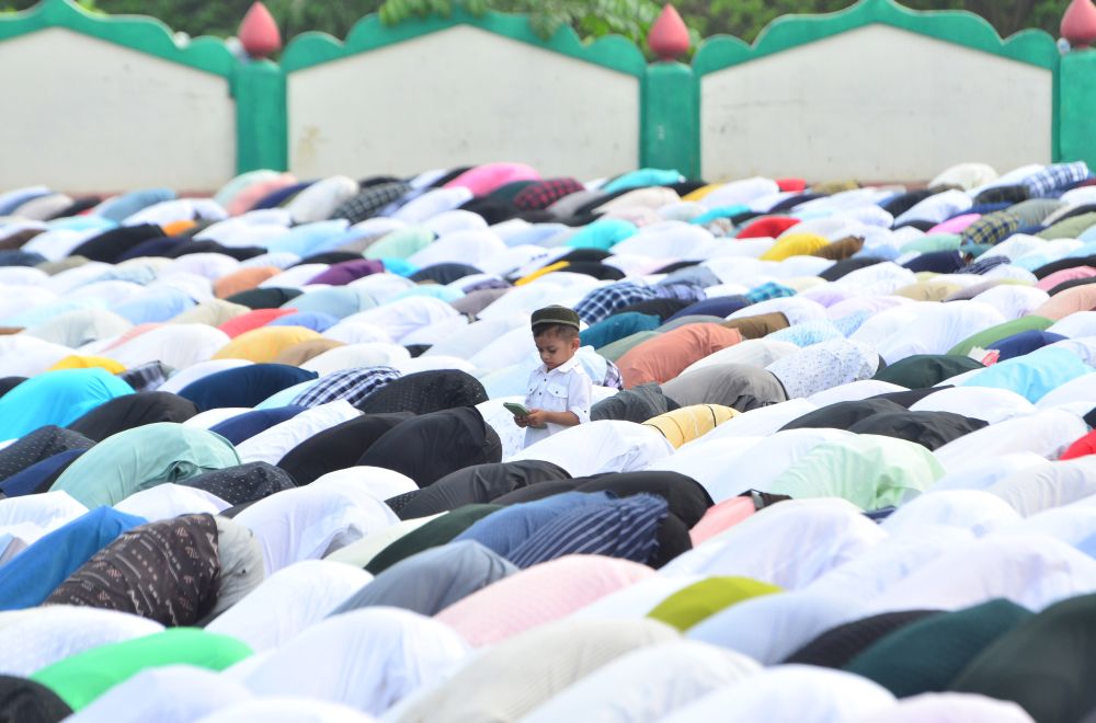 On Eid-al-Fitr, a child nonchalantly browses a Smartphone as Muslim devotees offer prayer to mark the end of Ramadan at a mosque in Dimapur on April 22. Muslims around the world are celebrating Eid-al-Fitr which means the festival of the breaking of the fast. (Photo by Caisii Mao)