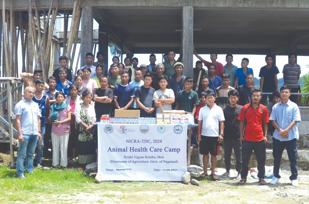 Krishi Vigyan Kendra (KVK) Mon conducted an Animal Health Care camp at Ngangching Village on August 13 under National Innovations in Climate Resilient Agriculture (NICRA). Dr Rongensusang (ACTO- Animal Science) briefed the farmers about the role of climate in livestock and poultry production. Zhiete (ACTO- Soil Science) highlighted the importance of collection of livestock and poultry waste for making manures. 54 farmers participated in the programme. The participants were provided with animal health care inputs and organic manures.