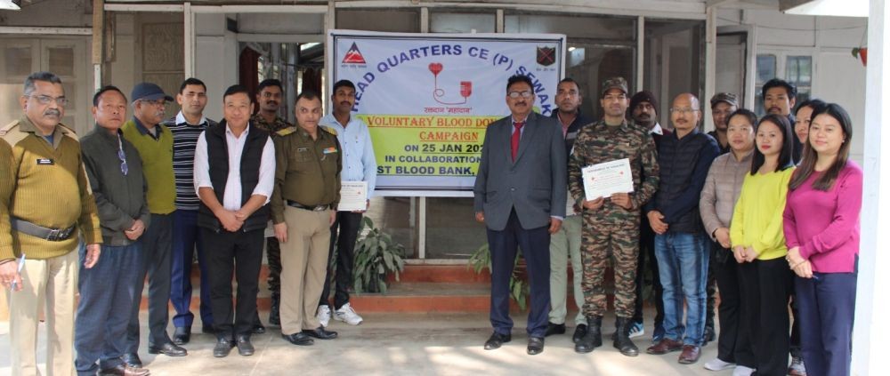 HQ CE Project Sewak, in collaboration with the Blood Bank, District Hospital, Dimapur, organised a blood donation drive at Central MI Room - Project Sewak, on the occasion of 76th Republic Day (January 26). This initiative brought together 51 donors, including six female employees and Family members. The event was, graced by KV Nagaraja Kumar, CE, Project Sewak, and Dr Rongsenmar Lkr, MOIC, Blood Bank team, among others. CE emphasised the importance of blood donation while fostering solidarity and inspiring others to make a difference.