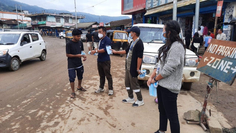 Lotha Students' Union (LSU) distributes face mask at Police Point area during an awareness camp at Wokha Town on July 27. LSU has cautioned the public, shop owners and commuters to use face mask and hand sanitizer. (Photo Courtesy: LSU)