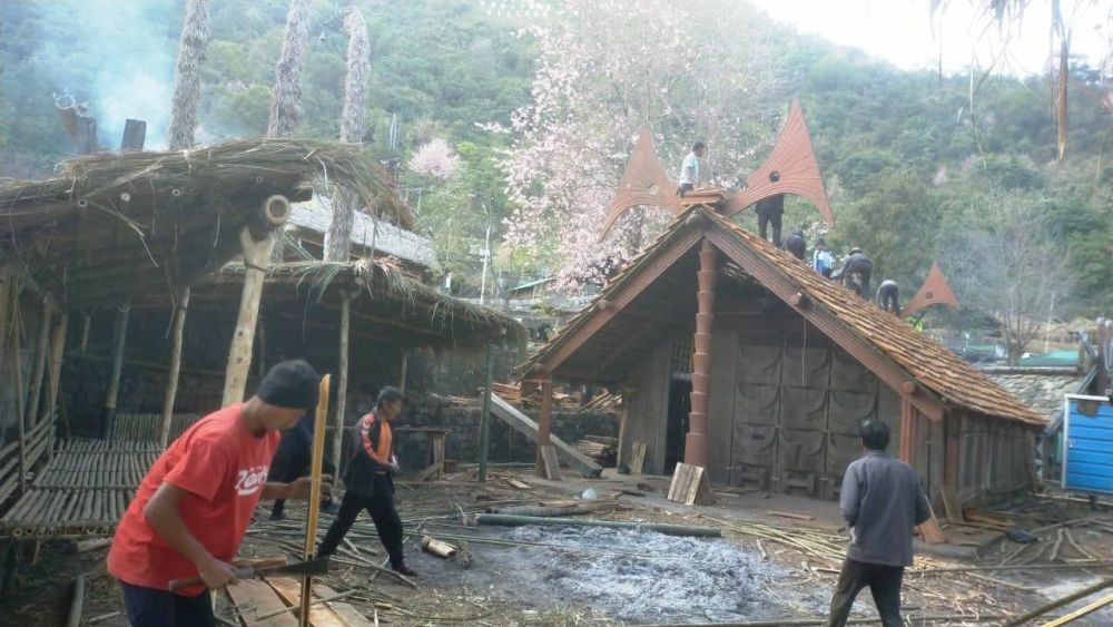 Zhavame villagers renovate Chakhesang Morung at The Naga Heritage Village, Kisama on November 13 for the forthcoming Hornbill Festival 2023. The festival will start from December 1. (Morung Photo)