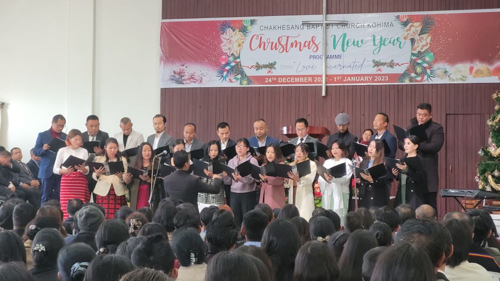 Believers perform special song of praise during Christmas celebration at Chakhesang Baptist Church Kohima on December 25. Christmas, was celebrated across Nagaland with religious fervour. In Kohima, both young and old in their finest dresses and decent mood thronged the different churches for Christmas service and offer prayer for love, affection and peaceful world. (Morung Photo)