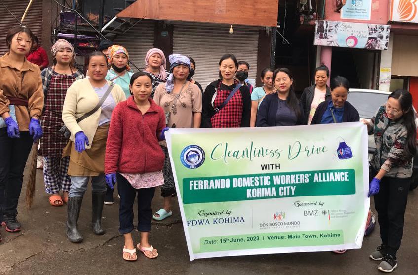 As part of the ongoing domestic workers’ week activities, the Ferrando Domestic Workers Alliance Kohima City (FDWA) has carried out cleanliness drive in Kohima on June 15. This cleanliness drive aim to create awareness among the public regarding cleanliness and its benefit. The FDWA staffs along with domestic workers undertook cleaning drainage and picking wrapping on the roads.