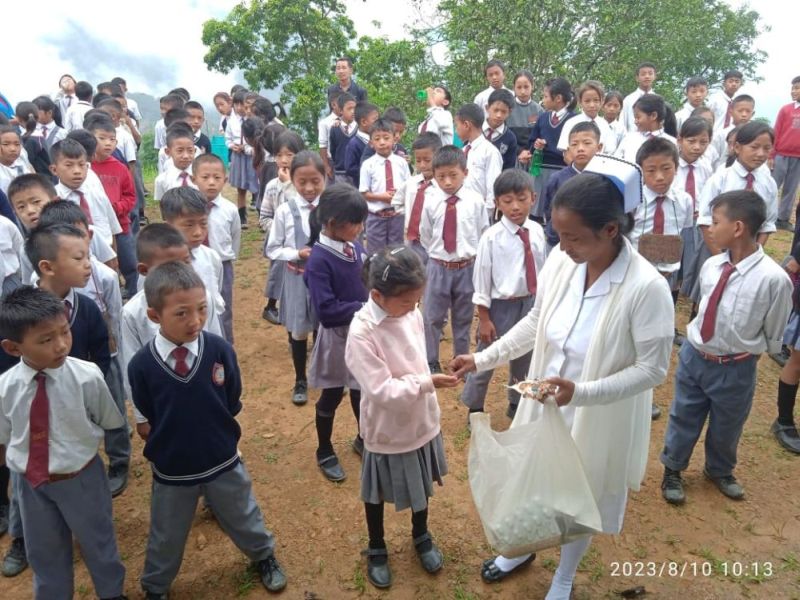 National Deworming Day 2023 launching programme was observed at Holy Cross School, Yongnyah village under Longleng district through the initiative of CHC Yongnyah under CMO Longleng on August 10. Dr Banglau Phom, Medical Officer, CHC Yongnyah highlighted the significance of the programme and the ill effects of intestinal worm infestations causing malnutrition and anemia which severely affect the physical and mental health of the growing children. He also gave an awareness talk on hygienic practices to reduce the spread of diseases and also demonstrated the step of hand washing to the students. Albendazole tablet was administered orally to each student present and a few tablets were handed to the school headmaster for Mop Up Day. The medical team was accompanied by one ANM, 2 ASHAs along with the medical officer. (DIPR Photo)