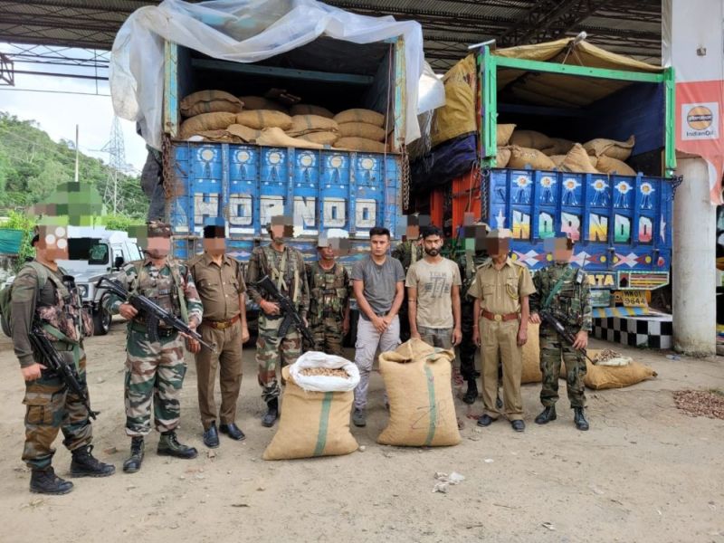 The Assam Rifles, on July 22, seized 20 tons (approximate) of areca nuts worth approximately Rs 2.4 crore from National Highway-2 near Kigwema. An official release from the HQ IGAR (North) informed that items were being smuggled through from Manipur to Nagaland in two trucks. The recovered items were handed over to the Customs Department, Kohima for further legal proceedings.
